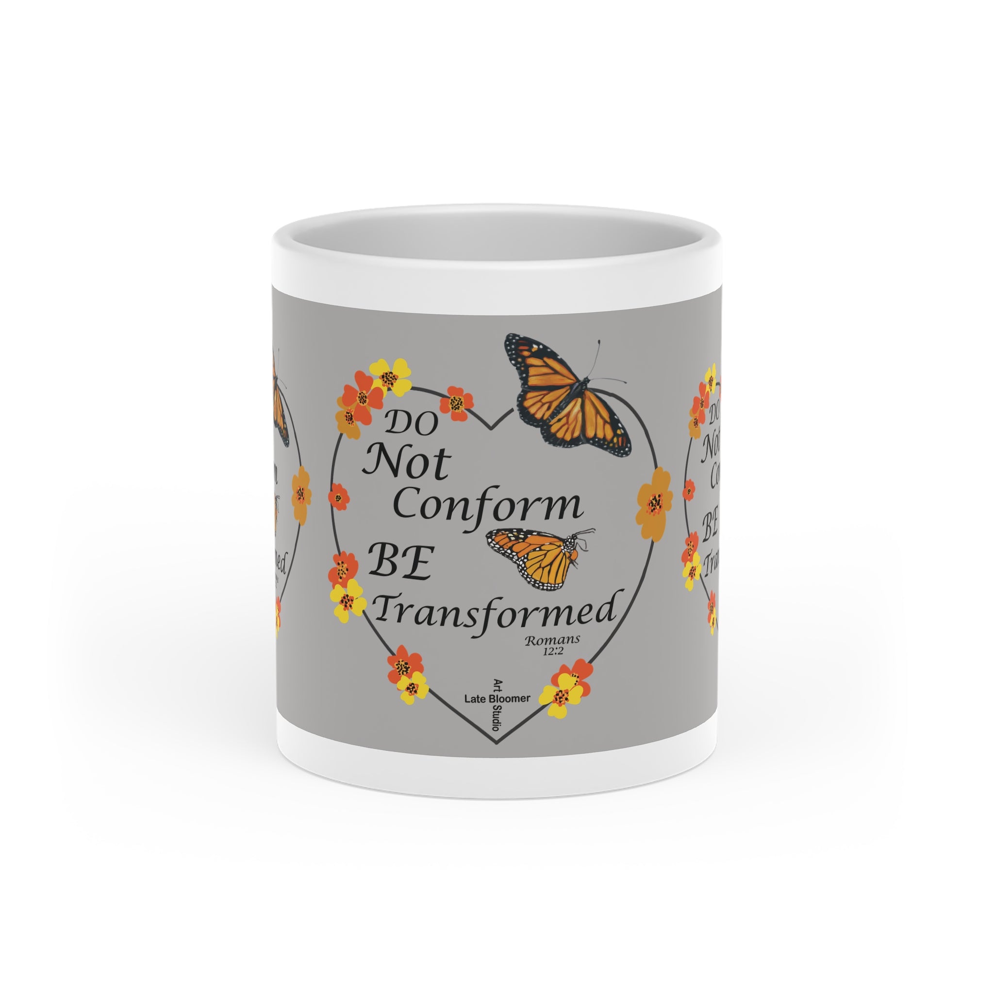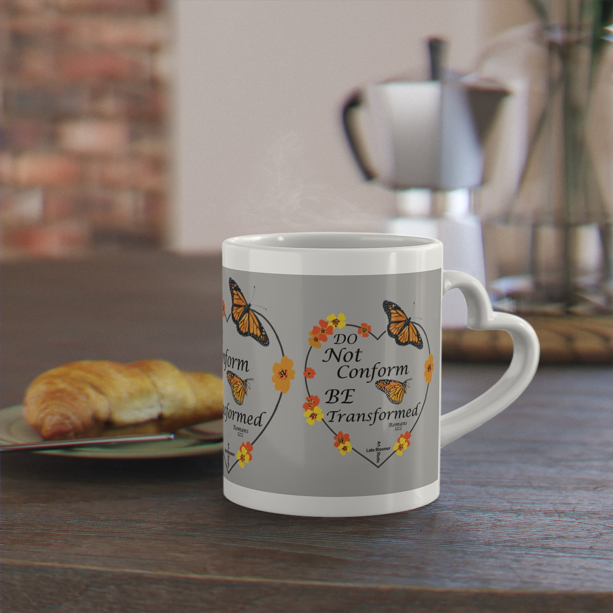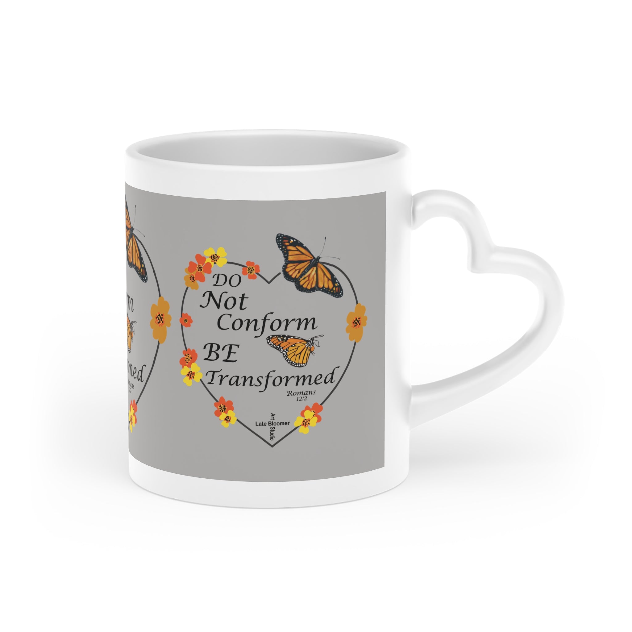 This light grey, whimsical original artwork Christian message coffee mug with a heart-shaped handle brings a touch of charm to your morning routine. Perfect for spreading love and positivity, this mug is a great gift choice for loved ones, fitting seamlessly into any cozy home setting. Ideal for Christian holidays, Christmas, Valentine's Day, or everyday use.