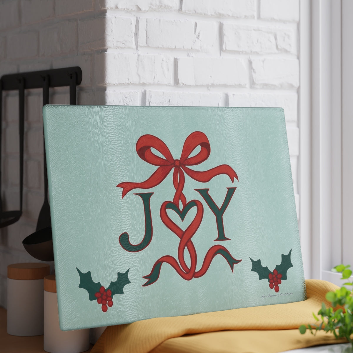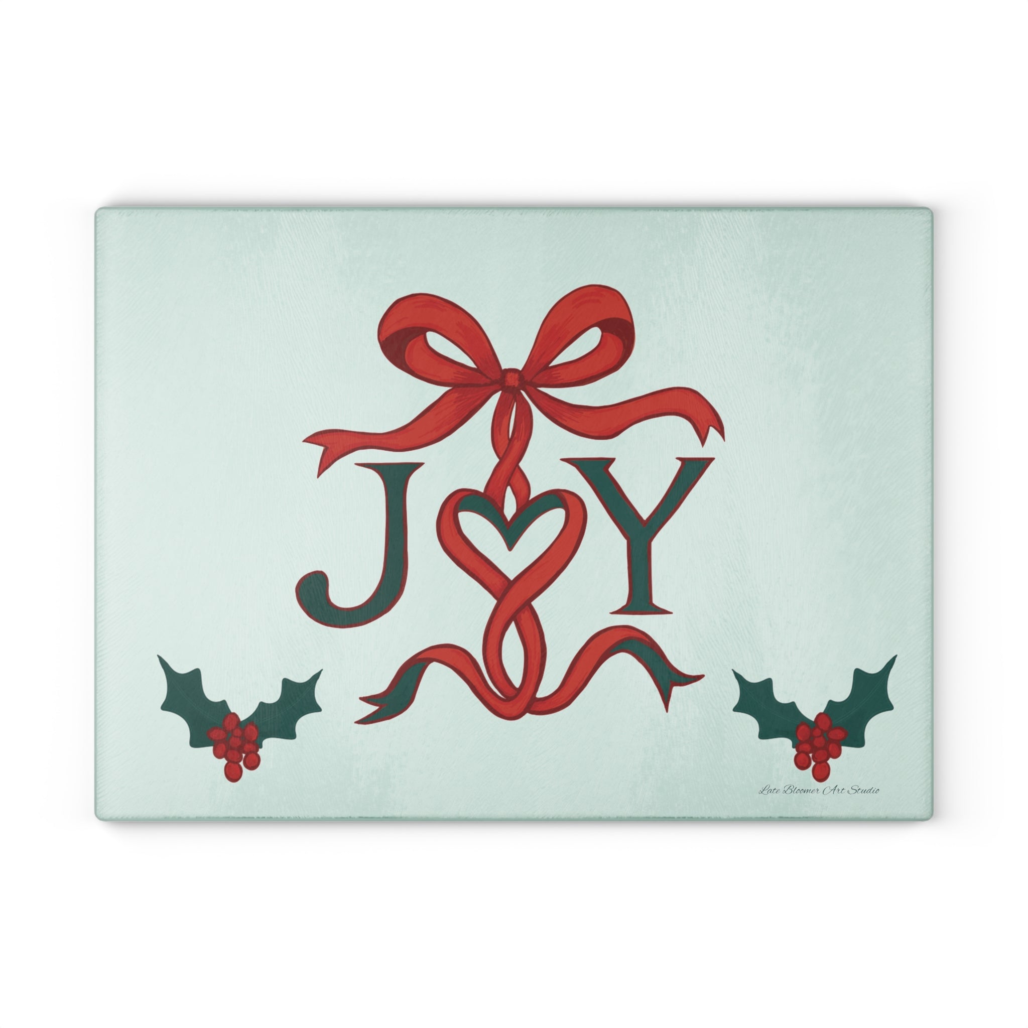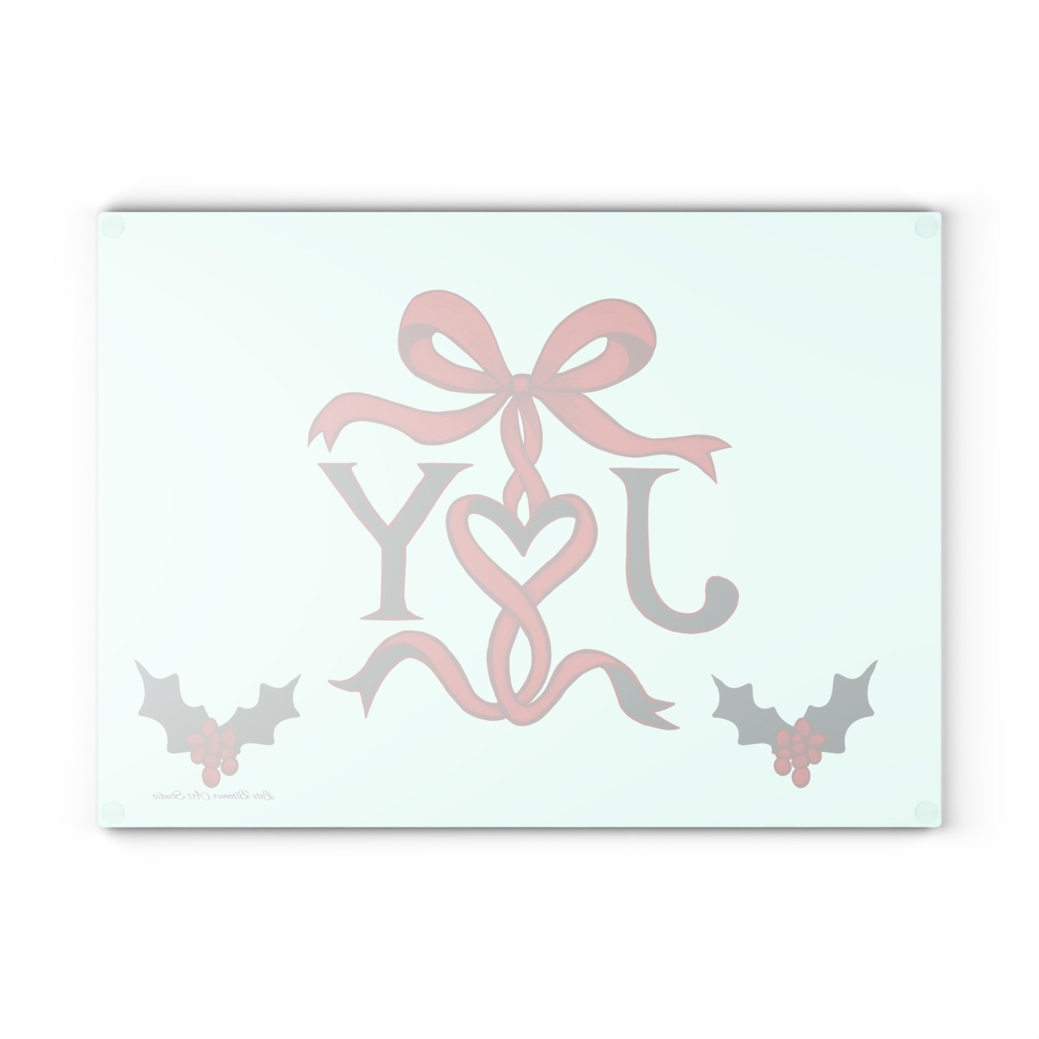 Bring a touch of festive elegance to your kitchen with this Joy Ribbon Tempered Glass Cutting Board, featuring my original artwork—a graceful red ribbon forming the word JOY with a heart nestled at the center. Soft holly sprigs frame the design, while the textured white background adds a modern Christmas charm.